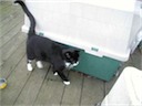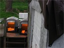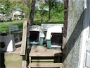 These cat condos Ed made from dog houses. They are connected w/a plastic drain pipe. conecting cconneconnecting them.