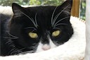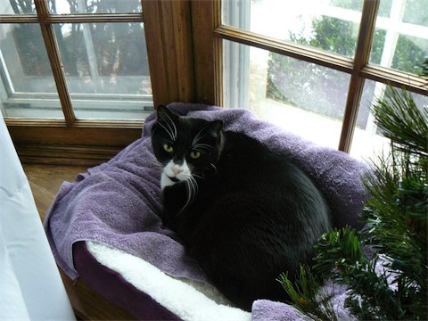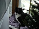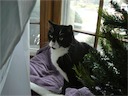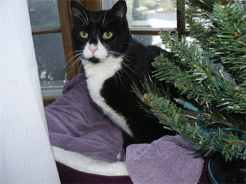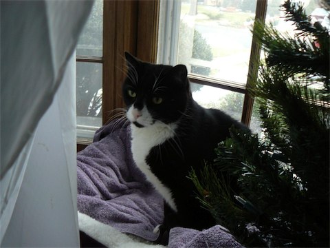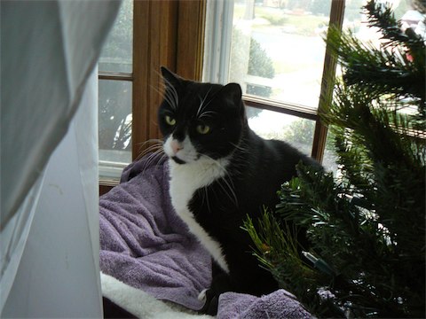 Full grown Cupcake sitting in the bay window next to the Christmas Tree.